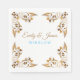 Party paper napkins shown in the white lluncheon size with a print of a fancy Golden colours leaf borders. Couple's last name highlighted in Sky Blue-Turquoise for you to personalise to your name choices. First names in a Golden colour. Coordinates with "gold fancy leaf border favour box" and the "gold fancy leaf border reception invitation card".