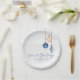 Seas and Greetings Seashell Ornament on Coastal Wood Holiday Christmas Party Paper Plates featuring ocean navy blue and sandy tan shell ornaments hanging from sailing jute rope on coastal shiplap wood with elegant typography. Add your name or greeting for a fun nautical holiday party product. Please contact us at cedarandstring@gmail.com if you need assistance with the design or matching products.