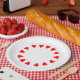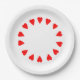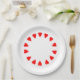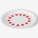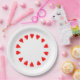 Red heart shapes in a circle at edge of plate. Bottoms of heart shapes point towards the centre.