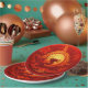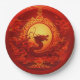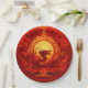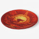 Imagine a round paper plate, coloured in a rich, vibrant red that instantly grabs attention. The plate is adorned with intricate dragon designs in gold and black, swirling majestically across the surface. Each dragon is detailed with scaled bodies, sharp claws, and fierce eyes, with wisps of smoke and flames subtly curling around them, adding movement and life to the scene. The edges of the plate may have a decorative golden border, tying the whole look together in an elegant, oriental-inspired style. The overall effect is bold, traditional, and festive, perfect for a themed celebration.
