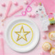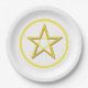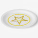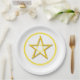 Star in three dimensions, sits in center of plate. Yellow star has a light yellow circle nestled within, and darker yellow circle runs around the outer edge of plate.