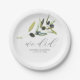 Elevate your event with these elegant olive paper plates, featuring a minimalist watercolor greenery design. The simple yet sophisticated botanical pattern in shades of green is perfect for rustic weddings and bridal showers. The trendy modern script typography showcases the words "we did," adding a touch of elegance to your celebration. Personalise with your custom greeting, names, and wedding date using the template fields provided.