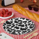 Black and white cow pattern on 9" paper plates. Great for farm animals them baby showers or birthday parties.