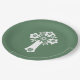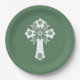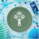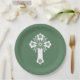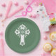 Fern green paper plates with a white floral cross. Part of the Floral Cross Christening Collection.