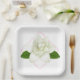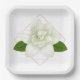 Party paper plate is shown in white with a art print of a lovely gardenia flower.
