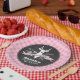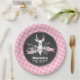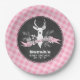 Pink woodland paper plates for girl baby showers. Features pink gingham, chalkboard graphics, and woodland deer.
