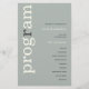 Paper Simple Sage Ivory Text Wedding Program. A great value PAPER (not card) alternative at a budget price. A modern typographical design with Program in large typography in Ivory with the ”r” in grey, rotated and to the left hand side on a background of light sage green. Background and text colours can be changed if you wish via Customise further.