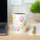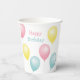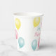 Party paper cups with colourful pastel party balloons with the greetings, Happy Birthday and the name of the person being honoured.