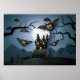 Papercut haunted castle on a hill with a full moon, mountains, trees, and cute bats.