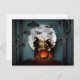 Papercut-look Halloween scene with witches brewing something in a cauldron in the night woods with a full moon and bats.