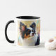 This colourful mug celebrates the adorable and energetic Papillon dog! Two sides of the mug have a beautiful portrait of a Papillon Dog against an abstract background. Predominant colours are blue, pink, gold and more. At the centre is script that says Papillon, but you may change it or even personalise it, if you wish. This mug will get noticed!