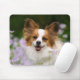 A White and Red Papillon dog sitting in a meadow surrounded by Cuckooflower. The Papillon is an alert, friendly and very smart toy breed. This little lovely doggy was photographed by Katho Menden, this mousepad is an enchanting special gift idea for doglovers.