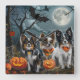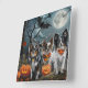 Unleash the spooky spirit with this eerie Halloween design featuring a pack of dogs under a dark, moonlit sky, surrounded by flying bats and glowing pumpkins. Perfect for those who love a touch of frightful fun with their furry friends!