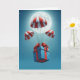 A blue gift box with red and white parachutes descends through a starry night sky, while the full moon glows brightly in the background.