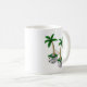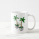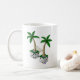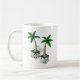 Two white dice with palm trees growing out of the tops, connected by a hammock. The trees are also surrounded by grass and pools of water that are trickling down the sides of the dice.