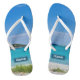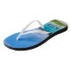 These flip flops feature an original photograph of a paradise white beach in Corse (France), with its beautiful sea with clear water in all shades of blue, under a blue sky on a sunny summer day, with an islet and a sailboat in the distance.