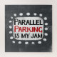"Parallel Parking Is My Jam" is a cute text design in grey with black and red text, along with a white accent shape and white textured whimsical dots surrounding it.