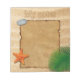 Old parchment paper with palm leaf, stone and starfish on beach sand background.