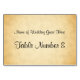 A wedding table setting place card design with a printed background design in the style of vintage old paper, designed to look similar to a faux parchment pattern. The background is a pattern print in yellowy beige / tan colours. There is stylish black text that can be personalised. Seating and table number cards for wedding guests.