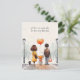 A cute back-to-school postcard with an illustration of a cute schoolgirl holding hands with his parents and with the default customisable text "we'll be on your side for the very first day!" text. There is also a puppy accompanying the family.