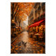 Capture the cozy elegance of Paris in autumn with this warm and inviting poster. This vertical artwork showcases a charming Parisian café street with glowing lights, classic stone architecture, and cobblestone pavement scattered with golden fall leaves. The rich autumn colors and soft lighting evoke a peaceful, romantic atmosphere inspired by everyday life in Paris.