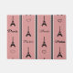 Paris illustration with Eiffel Tower and heart decoration and Paris text design on black, white and pink striped background