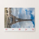A beautiful view of the Eiffel Tower in Paris in France from across the river Seine printed on a puzzle.