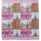 This shower curtain has art by Kristie Hubler, inspired by the Eiffel Tower, Paris, France, and the indoor shop facades of Paris Las Vegas, in the pointillism technique, developed by French artist Georges Seurat, the painter of La Grande Jatte hanging in the Metropolitan Museum of Art in NYC, On one side is a collage, some have called it an ideal "heater's quilt" with block collage images, landscape paintings in the pointillist style, inspired by past photos of Paris, the Eiffel Tower, France, grain from wood boards from French oak wine barrels, Provence picnics with wine, grapes, and iris flowers, or fleur de lis, in pink, lilac, grey lavender, sky blue, limestone, moss green, mustard, clay orange, grey, and black. Lilac pink top & bottom borders.