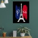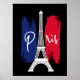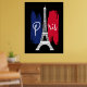 Stylish artistic design featuring the Eiffel Tower with bold blue and red brush strokes, showcasing the word "Paris" in a modern, handwritten font.