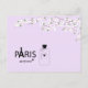 Pretty blossoms on a soft mauve background colour, the words Paris perfume with the Eiffel tower detail. A fancy perfume bottle beside it.