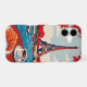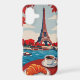 Take your favorite country and its traditions with you all day. An illustrated phone case design showing the Eiffel Tower, viewed from a coffee shop, having a coffee and a typical french croissant.