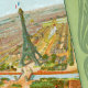 Exposition Universelle was the World's Fair of 1900 held in Paris. The fair was planned with great enthusiasm and exhibited many new examples of inventions and architecture such as diesel engines and moving walkways. The Eiffel Tower, showcased as an attraction for the second time, was painted yellow. This illustration gives us an aerial view of the fair, the Eiffel Tower and Paris.