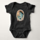 A baby bodysuit with a papercut picture of a Paris Eiffel Tower.