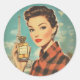 A glamourous 1950s vintage poster featuring a sophisticated woman in red plaid holding a luxurious perfume bottle labelled “PARFUM.” The Eiffel Tower rises in the background, enhancing the chic Parisian aesthetic with bold colours, retro fashion, and classic beauty.