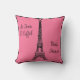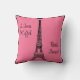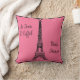 Ooh la la! Pretty French inspired throw pillow is done in shades of Parisian pink and deep black. Illustration of the Eiffel Tower, and the words Le Tour D'Eiffel, and Paris, France.