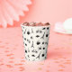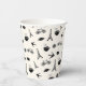 Chic Paris inspired paper cups feature a pattern of tiny birds, croissants, macarons, roses, coffee cups, and of course, the Eiffel tower, in black and white on a pale cream background, for a sweet and whimsical take on the timeless city.