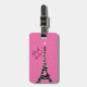 A bright pink luggage tag accented with the Eiffel Tower, lit up at night.