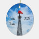 Two sided ornament featuring the Eiffel Tower of Paris, Texas on one side and a close up of the red hat on the other.