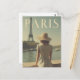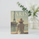 This elegant vintage poster captures a romantic Parisian moment: a woman in a flowing 1950s dress stands gracefully by the Seine River, gazing towards the Eiffel Tower. The scene is bathed in warm, nostalgic tones, with soft reflections on the water and classic Parisian architecture in the background. The artwork evokes the timeless charm of mid-century Paris, combining vintage fashion with iconic landmarks. A perfect piece for lovers of retro elegance, Paris, and classic travel art.