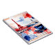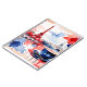Foregrounded against this urban panorama is a stylised blue cup of café au lait, perched elegantly on a saucer. The cup, detailed with subtle highlights, suggests a moment of relaxation and Parisian indulgence. The entire scene is accented with bold splashes of red and blue, with white spaces that provide balance and contrast, lending an abstract, dream-like quality to the composition. The fluidity of the watercolors gives the impression of a scene captured in the serene pause of a morning break, inviting the viewer to take in the timeless charm of Paris.