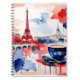The design features an artistic watercolor representation of a quintessential Parisian scene. Dominating the skyline is the Eiffel Tower, painted in a rich sepia tone that captures its iconic structure against a backdrop of muted city buildings.