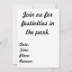 Many birthday parties, meetings, and gatherings are held in parks. This invitation shows a picture of a park playground on one side and on the back it says, Join us for festivities in the park. Date, Time, Place, and Reason are also listed to be filled in at purchase or later.