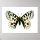 Parnassius apollo, a beautiful vintage drawing of a black, white and red butterfly.
