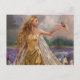 Fantasy card with a wonderful fairy in a golden costume who is holding a colourful parrot on her hand.