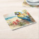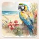 Watercolor artwork of a parrot, ocean water, and tropical flowers.