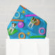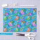 This colourful dog pool party tissue paper for Parson / Jack Russell Terrier lovers features a pattern of four different JRTs / PRTs with varied brown and black head/body markings and a charming doggy head tilt standing on their colourful blue, pink, orange and lime pool float mats with a tennis ball in a clear blue swimming pool, each wearing a colourful swim ring (with tiny JRT pattern) around her neck and surrounded by colourful swimming noodles and balls and yellow starfish-shaped floating chew toys - Parson / Jack Russell pool party © katz_d_zynes 2019
