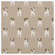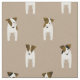This Parson Jack Russell fabric features a linear, staggered pattern of eight tiny cartoon "Jacks" with various brown and black facial and body markings - looking closely, you can see each of the dogs has a whimsical head tilt - the background colour is customisable, currently taupe - Jack Russell Terriers pattern © katz_d_zynes 2019