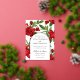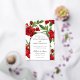 Floral arrangement sits behind the wedding ceremony details enclosed by an arch for this lovely red flowers invitation. The double arch is in real foil (gold, silver, or rose gold). The back of the invite is a small floral arrangement above the wedding date in black text on a white background.