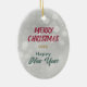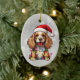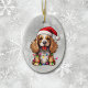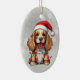 On the front of this Holiday ornament is an image of an adorable parti colour Cocker Spaniel dog wearing a Santa hat and wrapped in coloured Christmas lights. The image is set against a festive silver bokeh background. The back of the ornament has text in red, gold, and green.