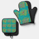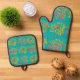 Partridges, pear trees, and snowflakes turquoise oven mitt & pot holder set